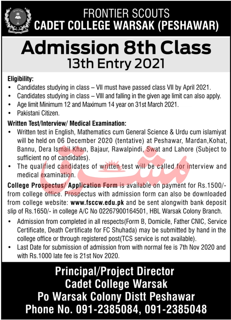 Pakistan Army Frontier Scouts Cadet College Warsak FSCCW Peshawar Khyber Pakhtunkhwa invites applications for admissions in Class 8th 13th Entry 2021. Read newspaper ad for exact details.