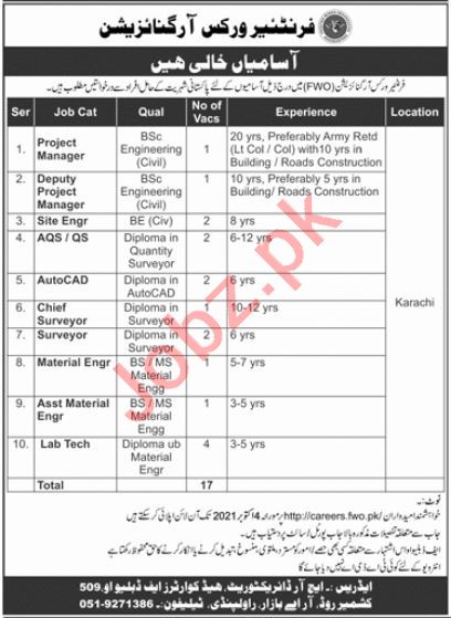 Pakistan Army Frontier Works Organization FWO invites applications from experienced and technical personnel for the posts of Project Manager, Deputy Project Manager, Site Engineer, Quantity Surveyor, Auto CAD Operator, Chief Surveyor, Surveyor, Material Engineer, Assistant Material Engineer and Lab Technician in Karachi.