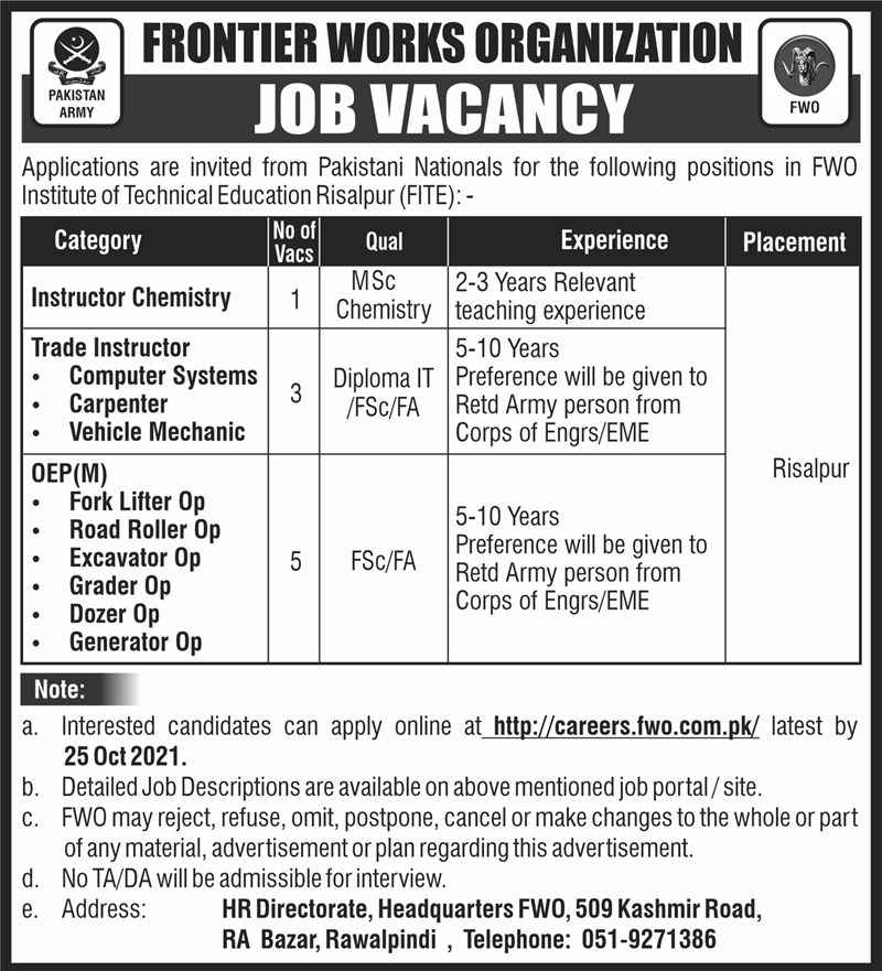 Vacancies in Frontier Works Organization FWO Advertisement October 2021