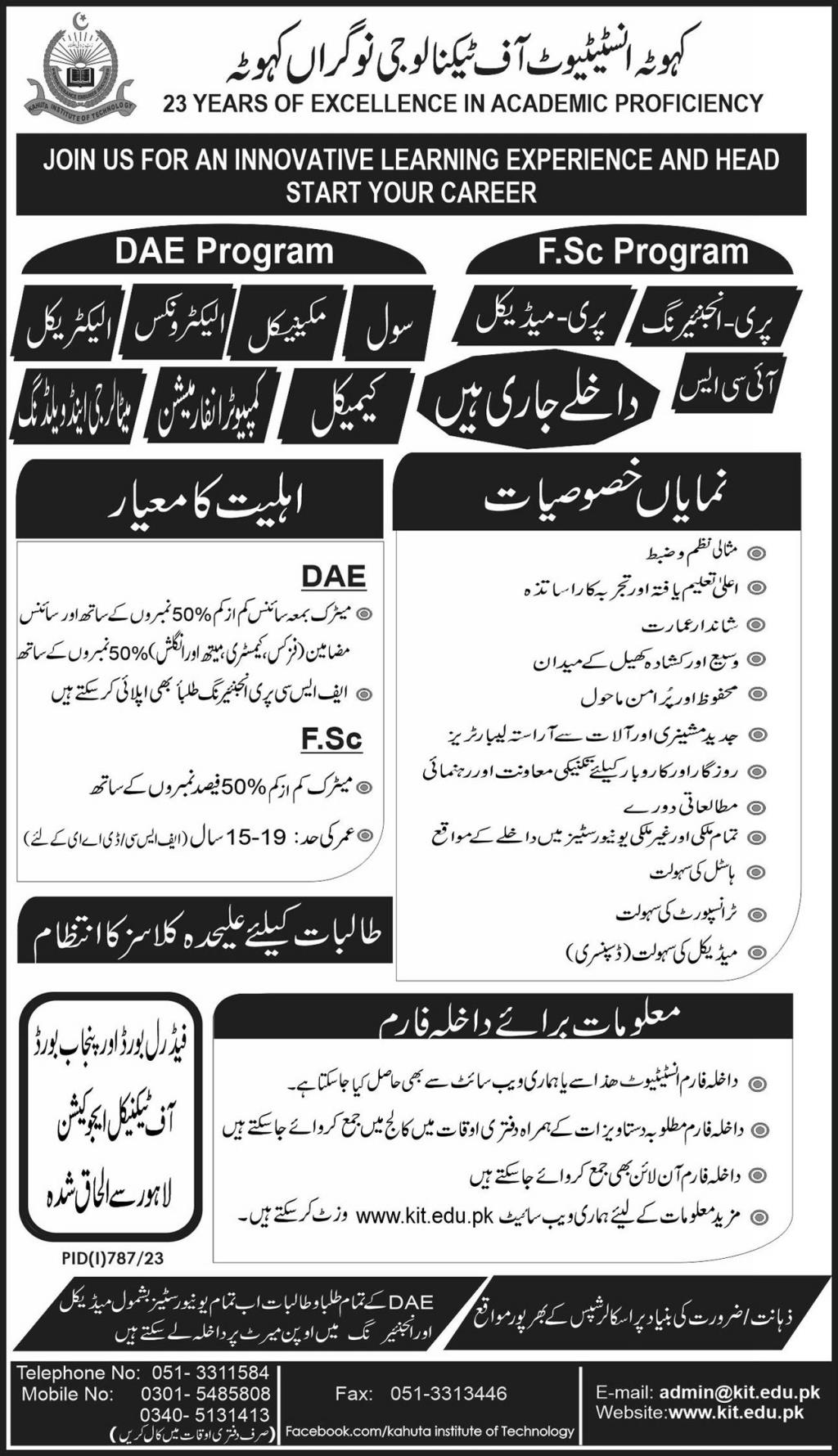 Kahuta Institute of Technology KIT admissions 2023 for FSc Classes, ICS, DAE Programs has been announced. Students can enroll for admissions in Kahuta Institute of Technology KIT Kahuta Punjab Pakistan for academic year 2023 to continue campus based or online education in Science College. Eligible students for fulfilling criteria for admissions in DAE, Intermediate and ICS can enroll as per Private admission policy 2023 till closing date 11 September 2023. Read newspaper ad for exact details.