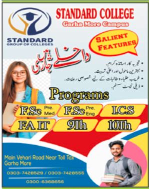 Standard College for Girls has announced admissions 2025 for FSC, ICS, FA. Eligible students can apply for academic admissions 2025 in Standard College for Girls Lahore Punjab Pakistan for Science College. Students for admissions in can apply for online or campus classes as per Government institute criteria till admission closing date. Read newspaper ad for exact details.