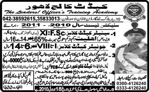 FSC in Cadet College Lahore Admissions 2010 Read newspaper ad for exact details.