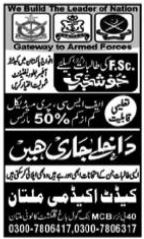 Admissions in Cadet Academy Multan 2024 for FSc Preparatory Classes has been announced. Cadet Academy Multan Multan Punjab Pakistan welcomes students to apply for admissions in academic year 2024 in Science College. Eligible candidates for admissions in Intermediate can apply as per Private institute criteria and before closing date 24 June 2024 after reading advertisement online. Read newspaper ad for exact details.
