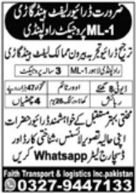 Vacant posts including driver and driver left hand are announced in Fujairah Transport & Logistics Inc Rawalpindi, rawalpindi Punjab Pakistan as per 16 September 2023 advertisement in daily Khabrain Newspaper. Matric and Middle etc. educational qualification will be preferred.