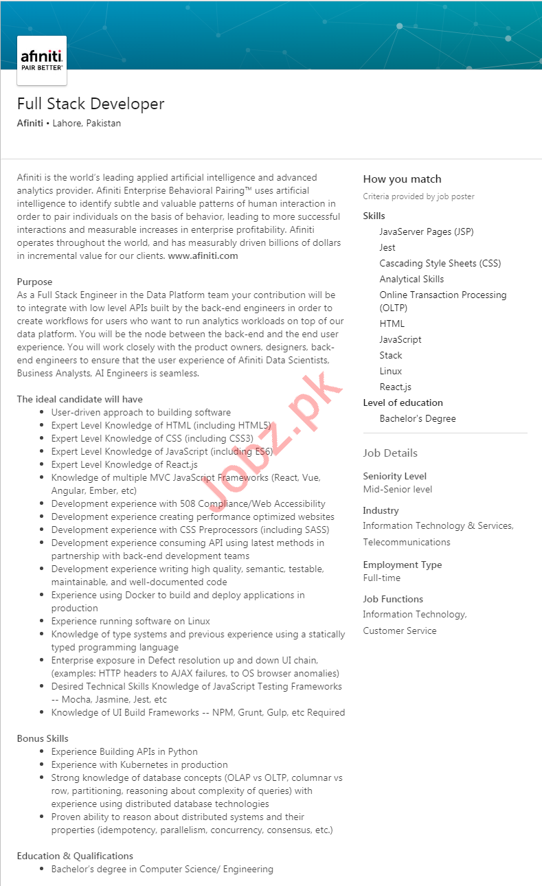 Latest Afiniti Software Solutions Pvt Ltd IT Posts Lahore 2025