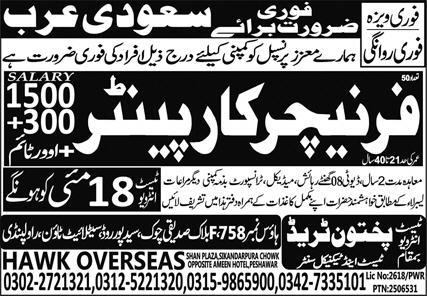 Vacant posts including furniture carpenter are announced in Hawk Overseas Riyadh, dammam Saudi Arabia as per 14 May 2024 advertisement in daily Express Newspaper. Persons with Matric and Middle etc. education can apply.