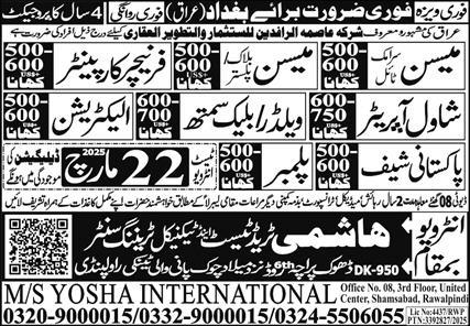 Hashmi Trade Test & Technical Training Center Baghdad, basra Iraq invites applications from eligible candidates for the post of block mason, furniture carpenter, shawl operator, ceramic tile mason, plumber, blacksmith, pakistani chef, plaster mason, electrician, mason and welder as per advertisement of March 21, 2025 published in daily Express Newspaper. Persons with Intermediate, Matric and Bachelor etc. education can apply.