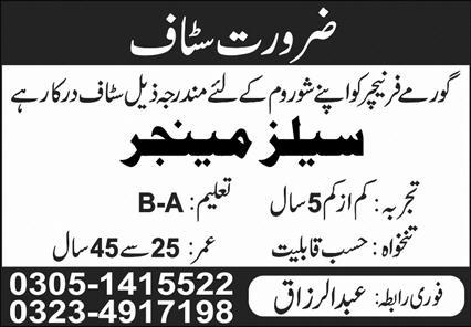Furniture Showroom Lahore, lahore Punjab Pakistan invites applications from eligible candidates for the post of sale manager as per advertisement of December 27, 2023 published in daily Express Newspaper. BA and Bachelor etc. educational qualification will be preferred.