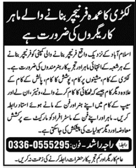 Furniture Factory invites applications for job positions advertised in daily Jang dated 10 November 2024 for following vacancies in Lahore, lahore Punjab Pakistan.