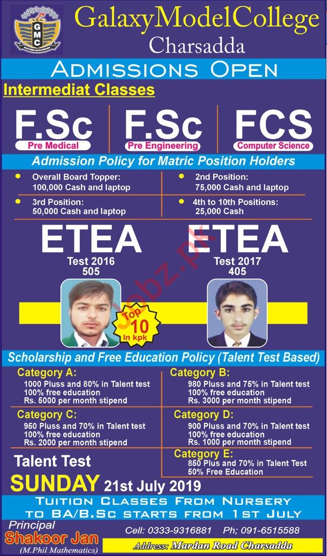 Galaxy Model College Charsadda, Pakistan are announced admissions fall 2019 for the classes of F Sc Pre Medical, Pre Engineering and Computer Science. Talent Test Sunday 21st July 2019. Read newspaper ad for exact details.