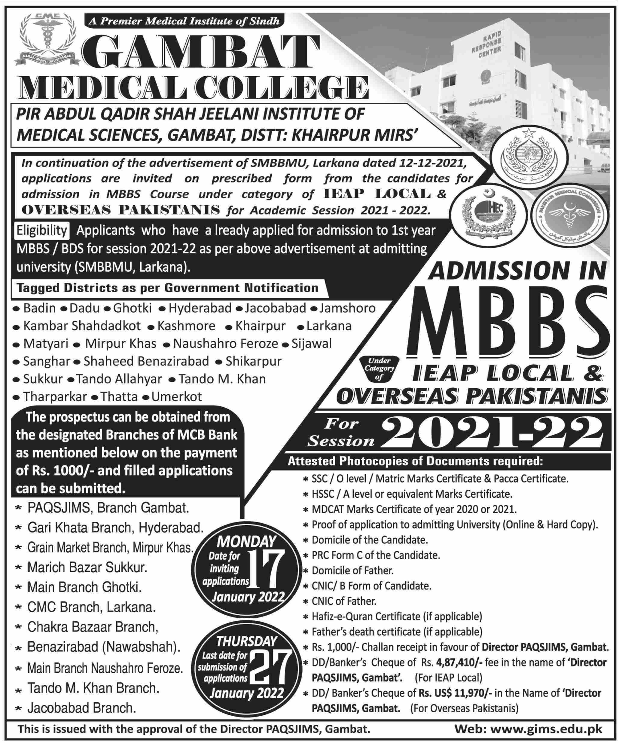 GAMBAT Medical College, Pir Abdul Qadir Shah Jeelani Institute of Medical Sciences admissions 2022 for MBBS, BDS has been announced. Pir Abdul Qadir Shah Jeelani Institute of Medical Sciences Khairpur Sindh Pakistan welcomes students to apply for admissions in academic year 2022 in Medical Medical College. Students for admissions in MBBS and BDS & criteria can apply as per Government institute admission policy 2022 before closing date January 27, 2022 as per advertisement. Read newspaper ad for exact details.