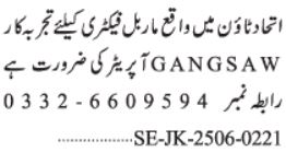 Marble Processing Company Itahad Town Karachi, karachi Sindh Pakistan invites applications from eligible candidates for the post of gang saw operator as per advertisement of June 20, 2025 published in daily Jang Newspaper. Educational qualifications required Matric and Intermediate etc.