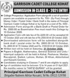 Pakistan Army Garrison Cadet College Government of Khyber Pakhtunkhwa invites applications for admissions in Class 8th in Kohat Khyber Pakhtunkhwa KPK 2020. Read newspaper ad for exact details.