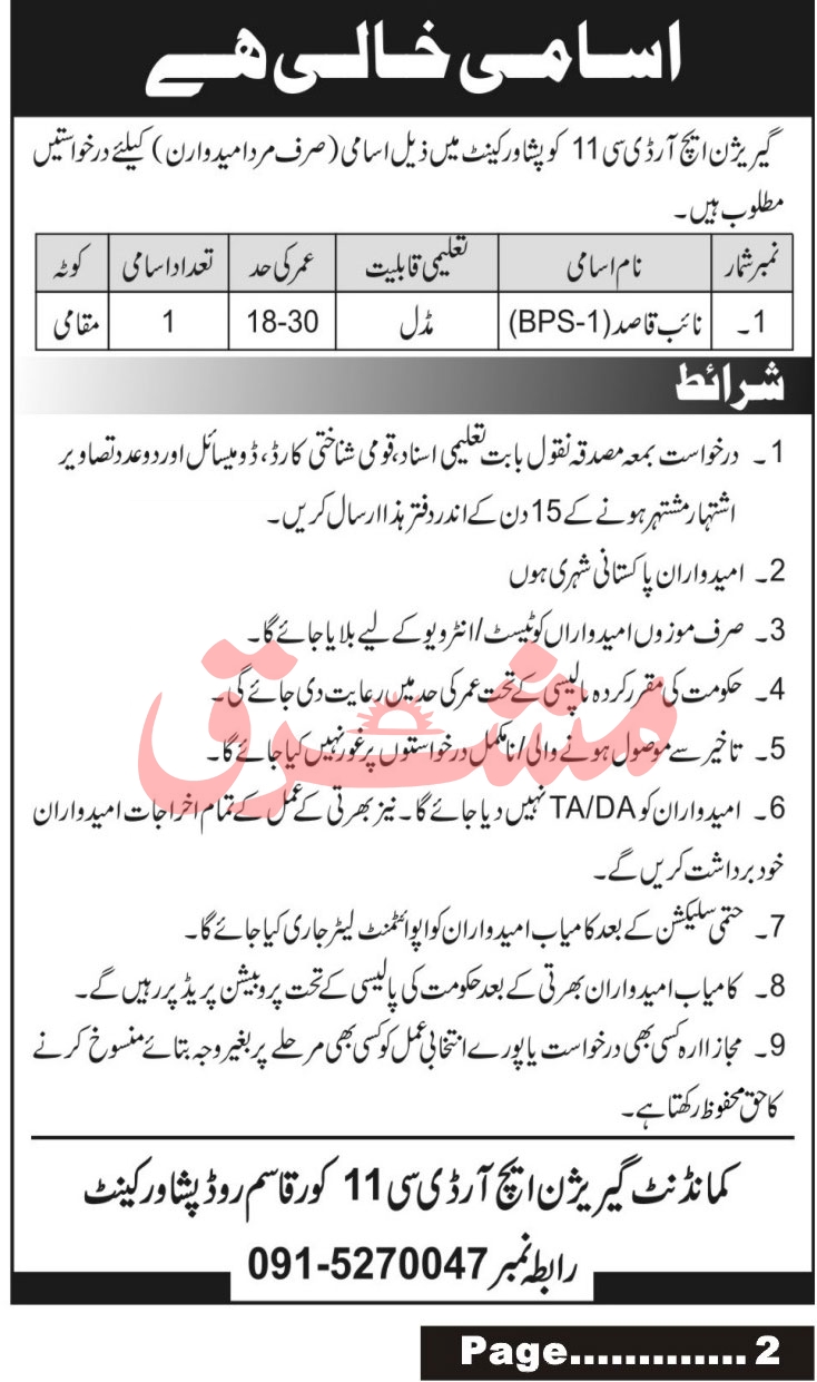 Garrison Human Resource Development Center Peshawar, peshawar Khyber Pakhtunkhwa KPK Pakistan invites applications from eligible candidates for the post of naib qasid as per advertisement of May 15, 2022 published in daily Mashriq Newspaper. Preferred Education is Middle etc.
