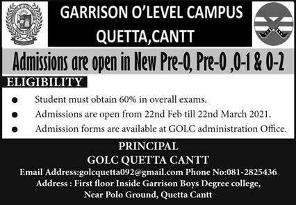 Garrison O Level Campus GOLC Quetta Cantt Balochistan is an educational institution has announced admissions in New Pre-0, Pre 0, 0-1 & 0-2. Admission forms are available at GOLC administration office. Read newspaper ad for exact details.