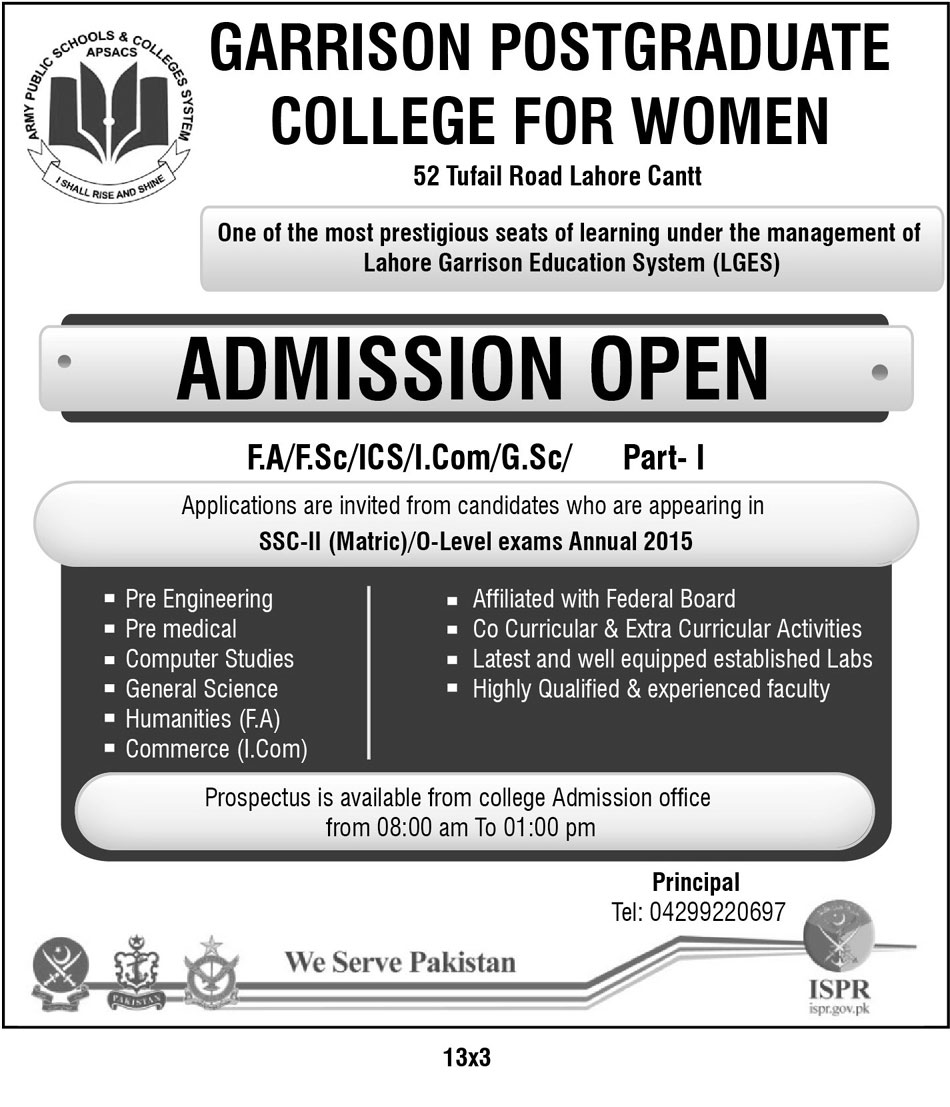 Garrison Postgraduate College For Women Admission in Fsc, ICs, I.Com and F.A in Lahore. Read newspaper ad for exact details.