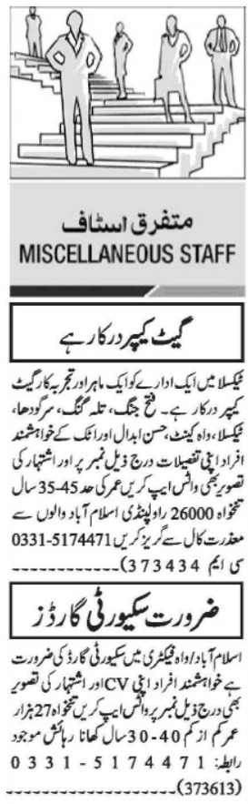 Private Company Islamabad, wah cantt, attock, fateh jang, hassan abdal, talagang, taxila and sargodha Islamabad Pakistan invites applications from eligible candidates for the post of gate keeper and security guard as per advertisement of August 5, 2023 published in daily Jang Newspaper. Middle and Matric etc. educational qualification will be preferred.