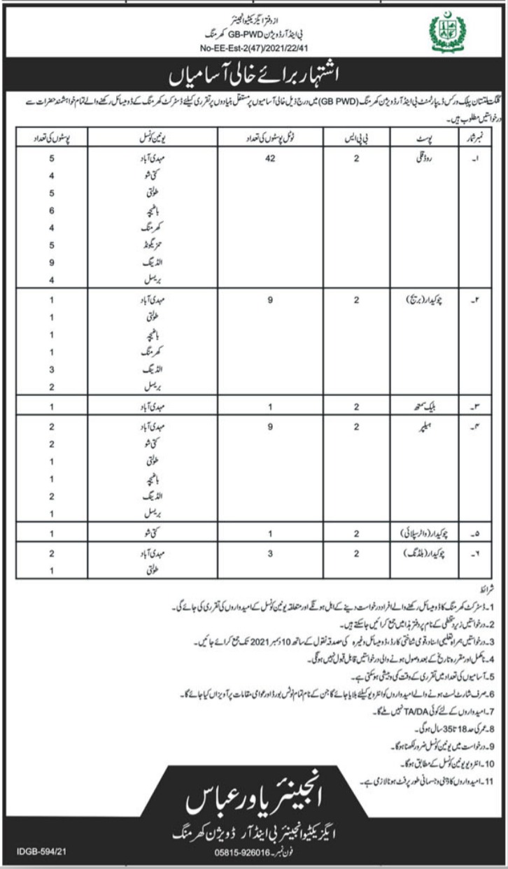Vacancies in Gilgit Public Works Department Advertisement February 2023
