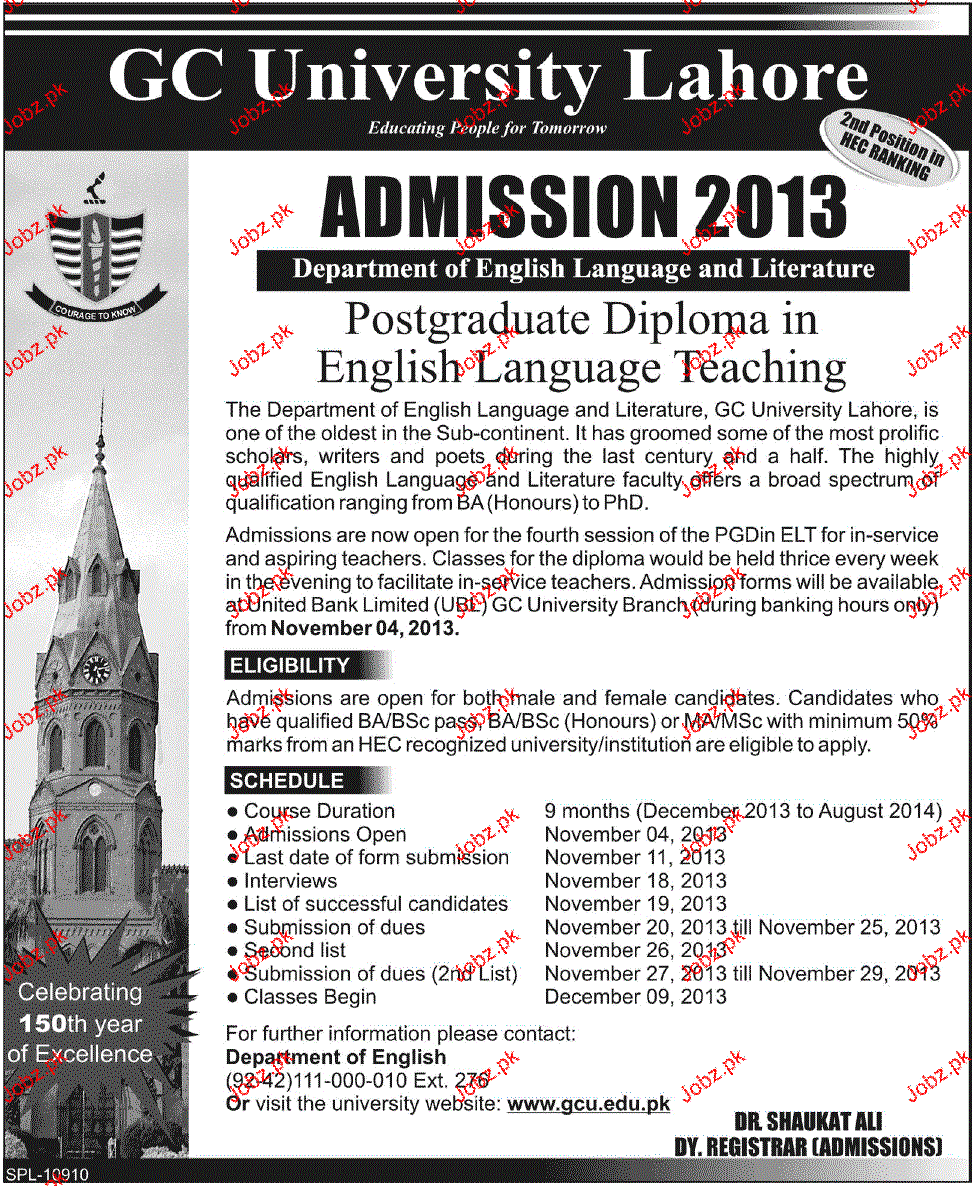 GC University Admission in Diploma in Teaching in Lahore Read newspaper ad for exact details.