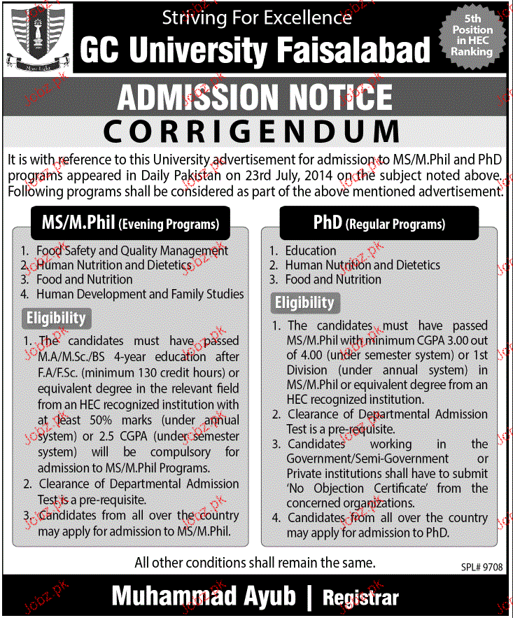 GC University Faisalabad Admission in MS / Mphill and Phd in Faisalabad. Read newspaper ad for exact details.