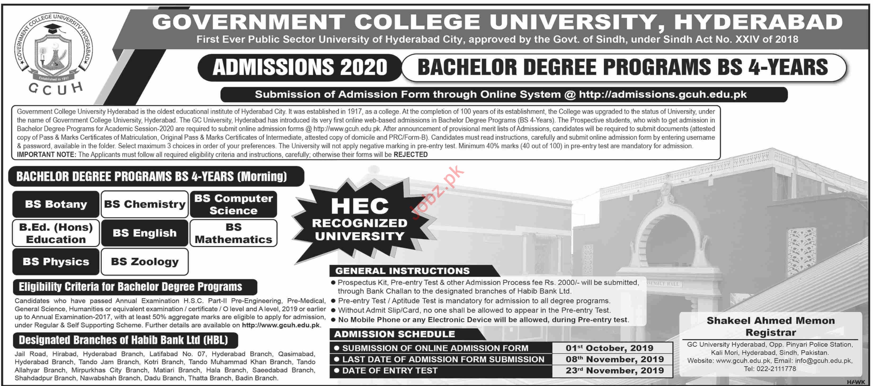 Government College University GCU invites applications for admissions in BS Botany, BS Chemistry, BS Computer Science, B.Ed Education, BS English, BS Mathematics, BS Physics, BS Zoology in Hyderabad. Read newspaper ad for exact details.