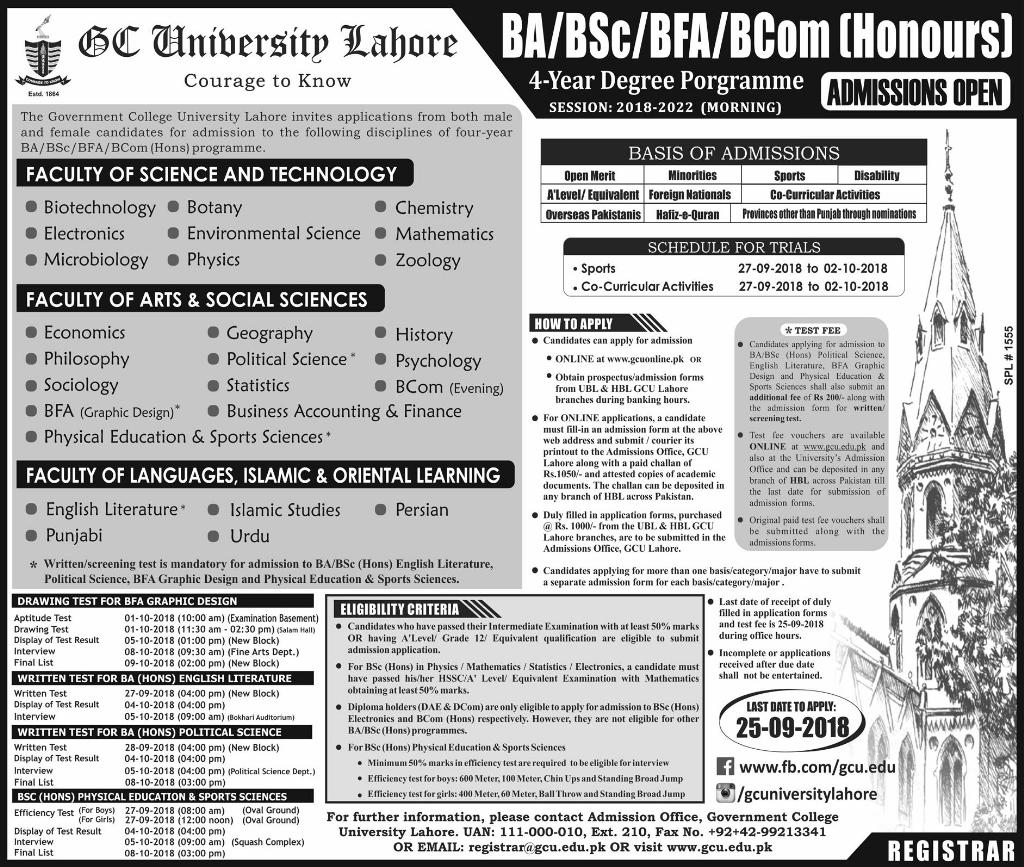 GC University Lahore Admission in BS in Botany, Physics, Zoology, Mathematics, Chemistry, Electronics, Sociology, B.Com, Political Sciences and History in Lahore. Read newspaper ad for exact details.