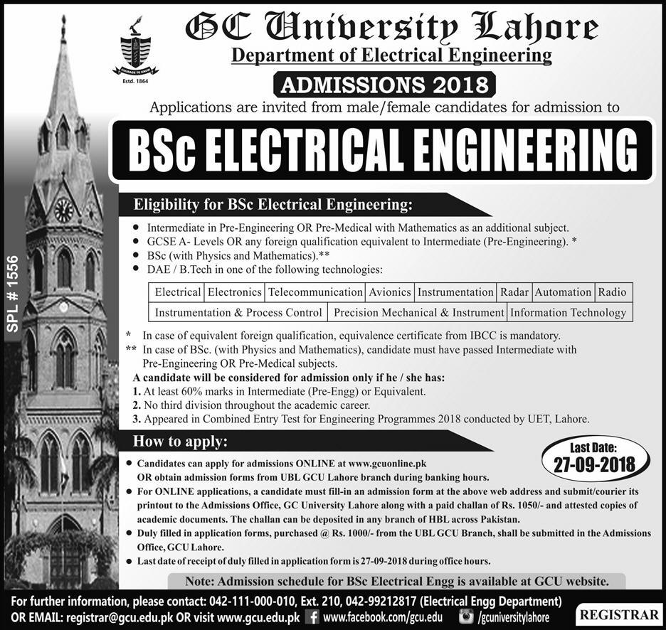 GC University Lahore Department of Electrical Engineering Admission in BSc Electrical Engineering in Lahore. Academic Session 218-2019. Admission Open for Both Male / Female Students Read newspaper ad for exact details.