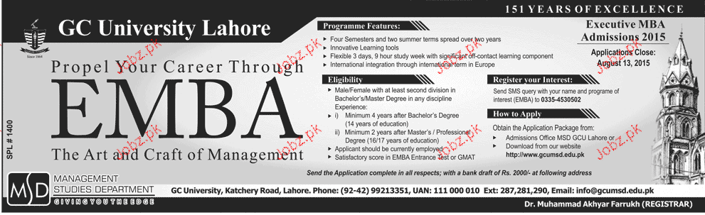 GC University Lahore Admission in EMBA in Lahore. Read newspaper ad for exact details.