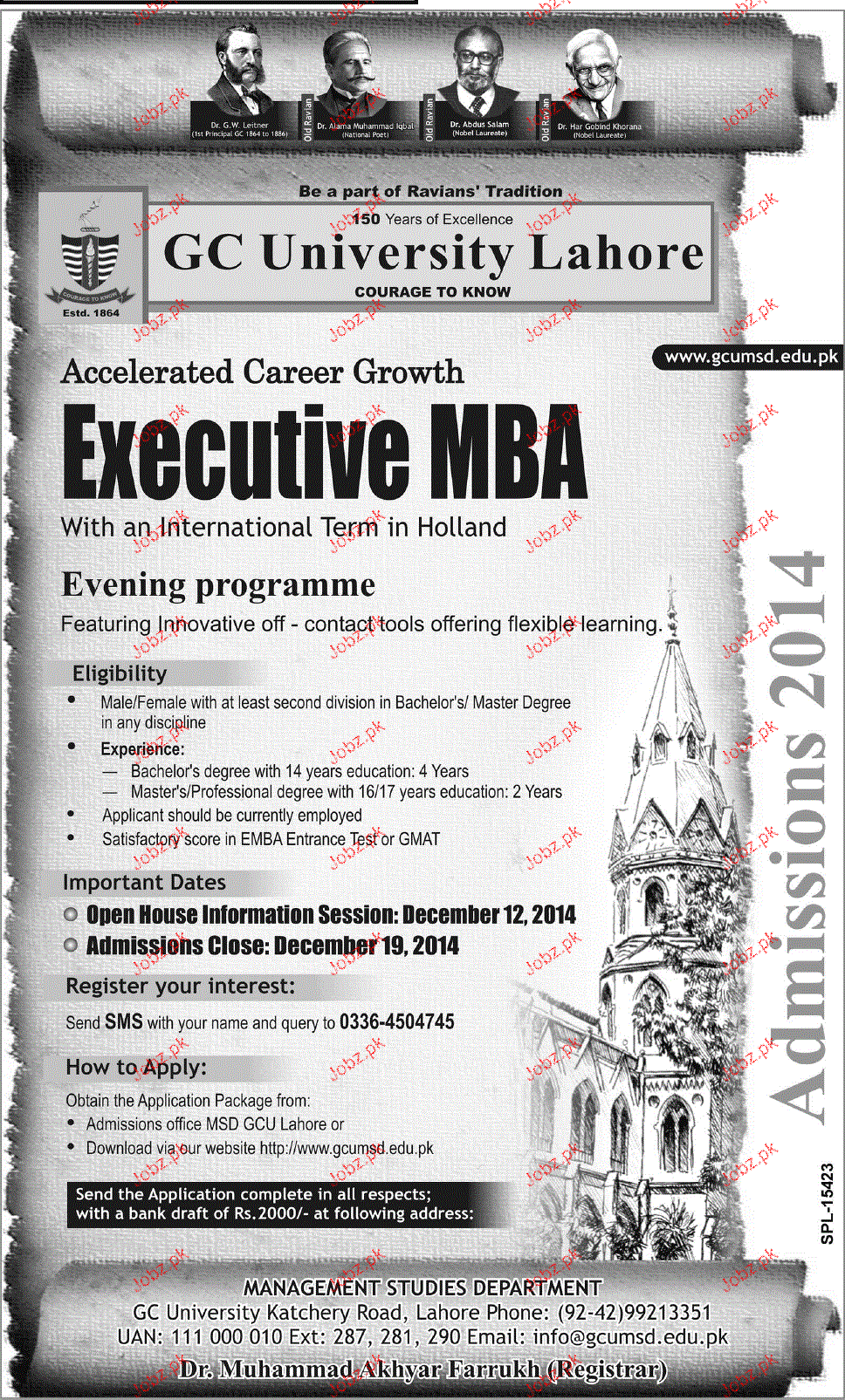 GC University Lahore Admission in Executive MBA in Lahore. Read newspaper ad for exact details.