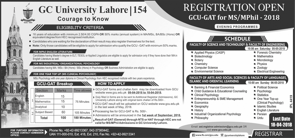 GC University Lahore Admission in GCU-GAT For MS / Mphill