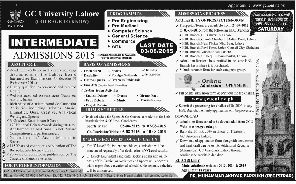 GC University Lahore Admission in Intermediate in Lahore. Read newspaper ad for exact details.