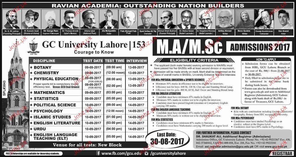 GC University Lahore Admission in MA / MSc in Lahore. Read newspaper ad for exact details.