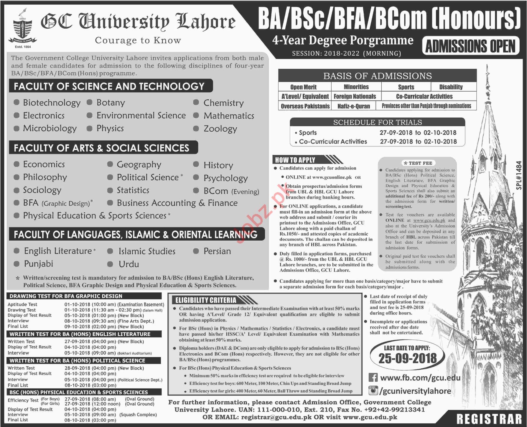 The Government College GC University Lahore invites applications from both male and female candidates for admission of four-year BA, BSc, BFA, B-Com Hons programme. Read newspaper ad for exact details.