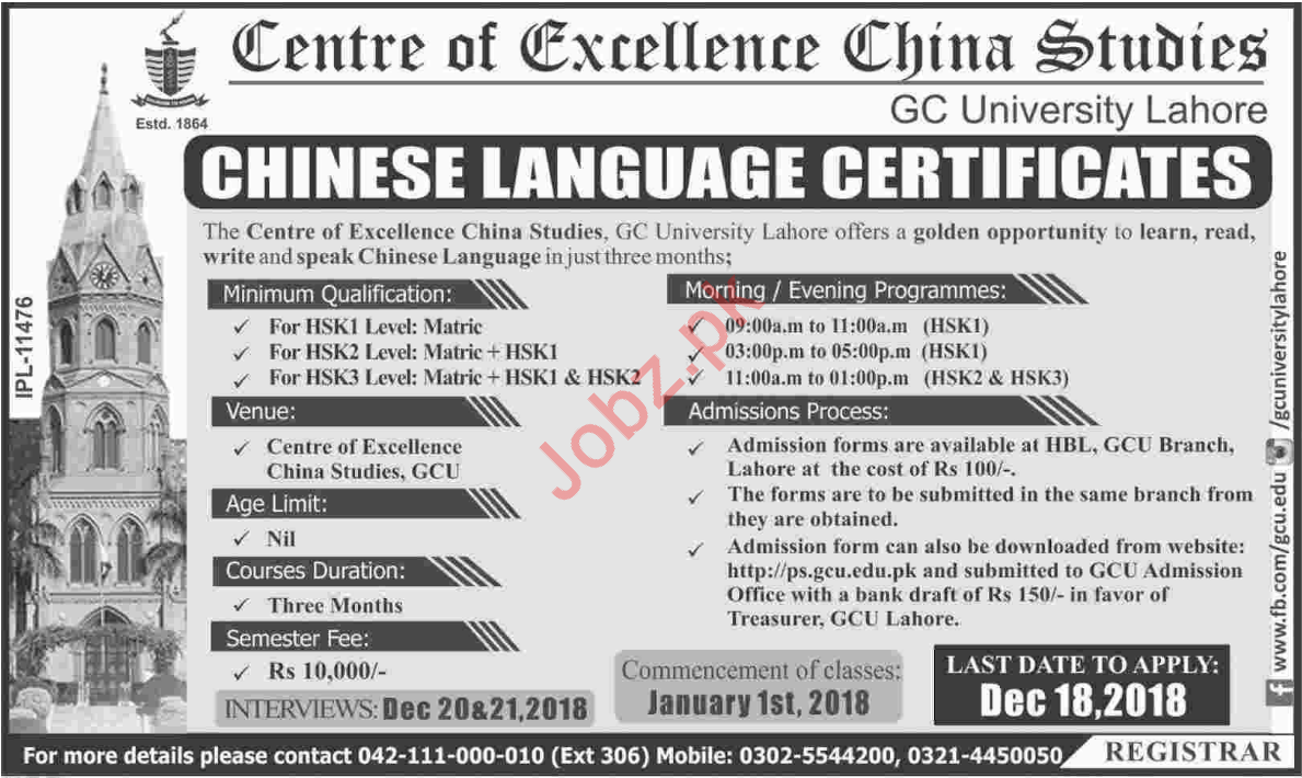 GC University Lahore Admissions Chinese Language Certificate