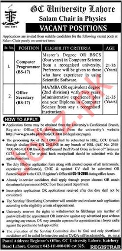 GC University Lahore Salam Chair In Physics Jobs 2018