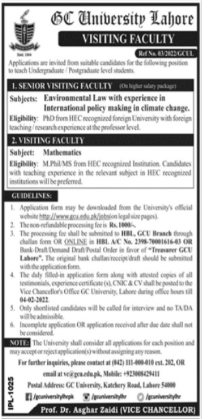GC University is looking for candidates for following posts as per job advertisement published in daily Jang Newspaper of January 29, 2022 for location Lahore Punjab Pakistan: