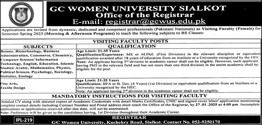 GC Women University Sialkot, sialkot Punjab Pakistan invites applications from eligible candidates for the post of lecturer mathematics, lecturer business administration, lecturer botany, lecturer political science, lecturer statistics, lecturer education, lecturer islamic studies, visiting lecturer, lecturer sociology, lecturer information technology, lecturer arabic, lecturer commerce, lecturer computer science, visiting professor, lecturer chemistry, lecturer psychology, lecturer biotechnology, lecturer physics, lecturer english and lecturer zoology as per advertisement of January 15, 2025 published in daily Express Newspaper. Persons with Mphil, MS and Phd etc. education can apply.