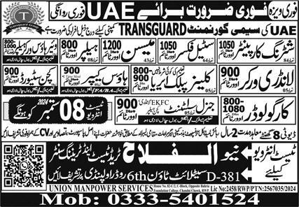 New Al Falah Trade Test & Training Center invites applications for job positions advertised in daily Express dated 4 September 2024 for following vacancies in Abu Dhabi, sharjah UAE.