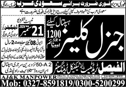 Al Faisal Trade Test & Technical Training Center Riyadh, madina Saudi Arabia invites applications from eligible candidates for the post of general cleaner as per advertisement of September 20, 2024 published in daily Express Newspaper. Persons with Middle and Matric etc. education can apply.