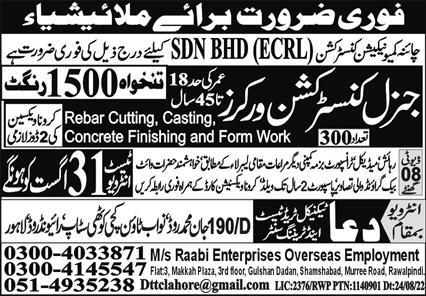 ua Technical Trade Test & Training Center Malaysia, malaysia Malaysia invites applications from eligible candidates for the post of construction worker and general construction worker as per advertisement of August 27, 2022 published in daily Express Newspaper. Preferred Education is Matric and Middle etc.