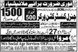 Social Age Services Overseas Employment Promotors Malaysia, malaysia Malaysia invites applications from eligible candidates for the post of general construction worker as per advertisement of August 25, 2022 published in daily Aaj Newspaper. Preferred Education is Matric, Middle, DAE and Intermediate etc.