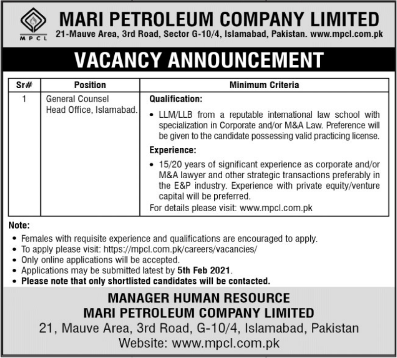 General Counsel Jobs In Mari Petroleum Company Limited