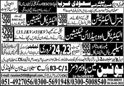 Union Manpower Services is looking for candidates for following posts as per job advertisement published in daily Express Newspaper of February 23, 2022 for location Dammam, dammam Saudi Arabia: