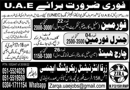 Zarqa International Recruiting Agency jobs advertisement dated about 14 February 2023 in daily Express Newspaper invites application for the vacant post of chargehand mason, steel fixer foreman, chargehand steel fixer, chargehand, chargehand scaffolding, civil foreman, general foreman, carpenter foreman, foreman and chargehand carpenter in Sharjah, abu dhabi UAE. Candidates with Bachelor, Intermediate and Matric etc. educational background will be preferred.