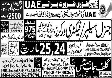 Gulf Job Hunts Manpower Services Abu Dhabi, sharjah UAE invites applications from eligible candidates for the post of general helper and factory worker as per advertisement of March 24, 2023 published in daily Express Newspaper. Persons with Matric and Middle etc. education can apply.