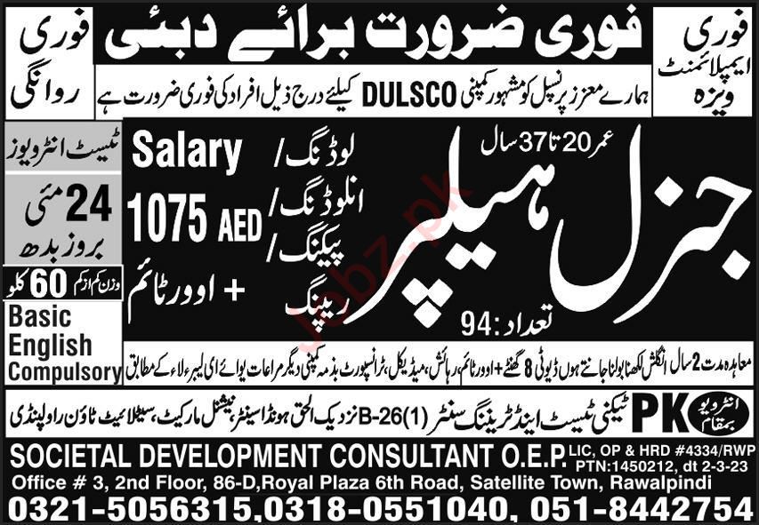 PK Techni Test & Training Center jobs advertisement dated about 21 May 2023 in daily Express Newspaper invites application for the vacant post of general helper in UAE, dubai UAE. Persons with Middle and Matric etc. education can apply.