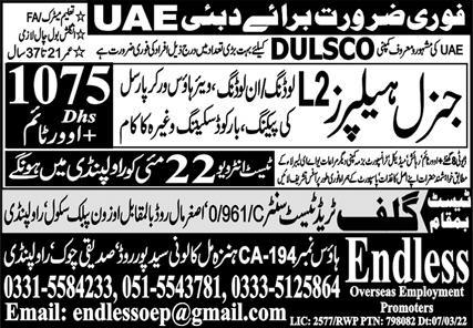 Vacant posts including general helper are announced in Endless Overseas Employment Promoters Dubai, abu dhabi Dubai as per 17 May 2023 advertisement in daily Express Newspaper. Intermediate and Matric etc. educational qualification will be preferred.