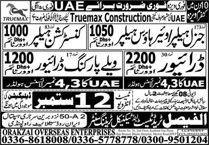 Al Faisal Trade Test & Technical Training Center jobs advertisement dated about 10 September 2025 in daily Express Newspaper invites application for the vacant post of construction helper, valet parking driver, driver, warehouse helper and general helper in Abu Dhabi, dubai UAE. Educational qualifications required Intermediate and Matric etc.
