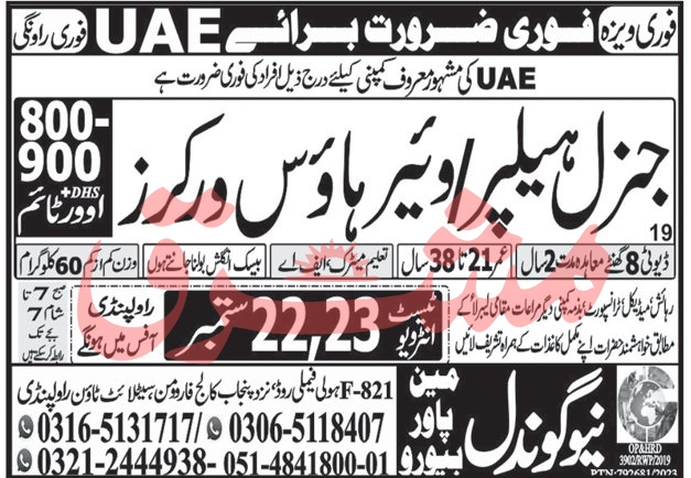New Gondal Manpower Bureau is looking for candidates for following posts as per job advertisement published in daily Mashriq Newspaper of September 23, 2023 for location UAE, uae UAE: