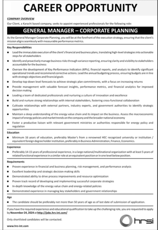 Human Resource Solution International HRSI is looking for candidates for following posts as per job advertisement published in daily Jang Newspaper of November 10, 2024 for location Karachi, karachi Sindh Pakistan:
